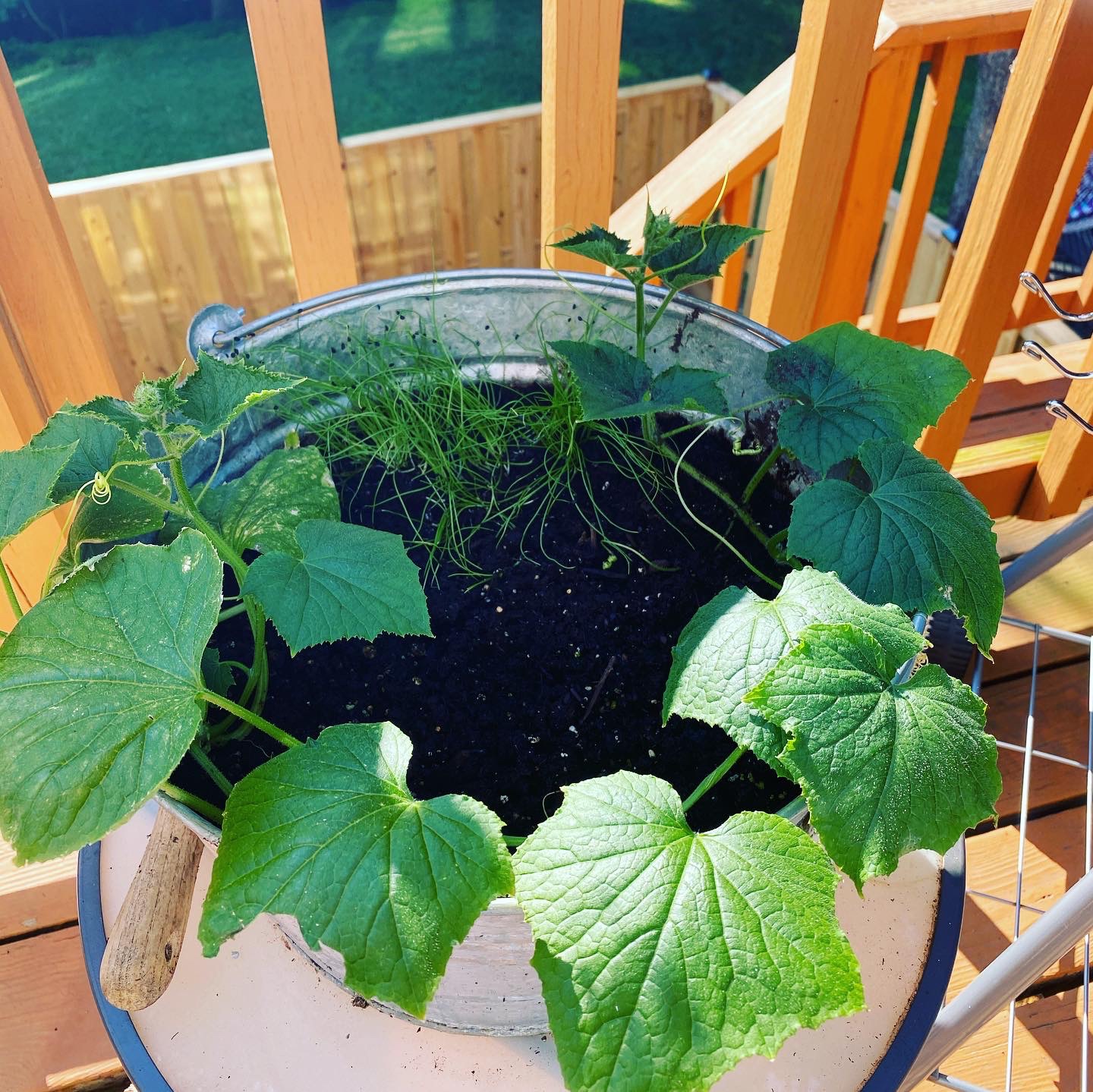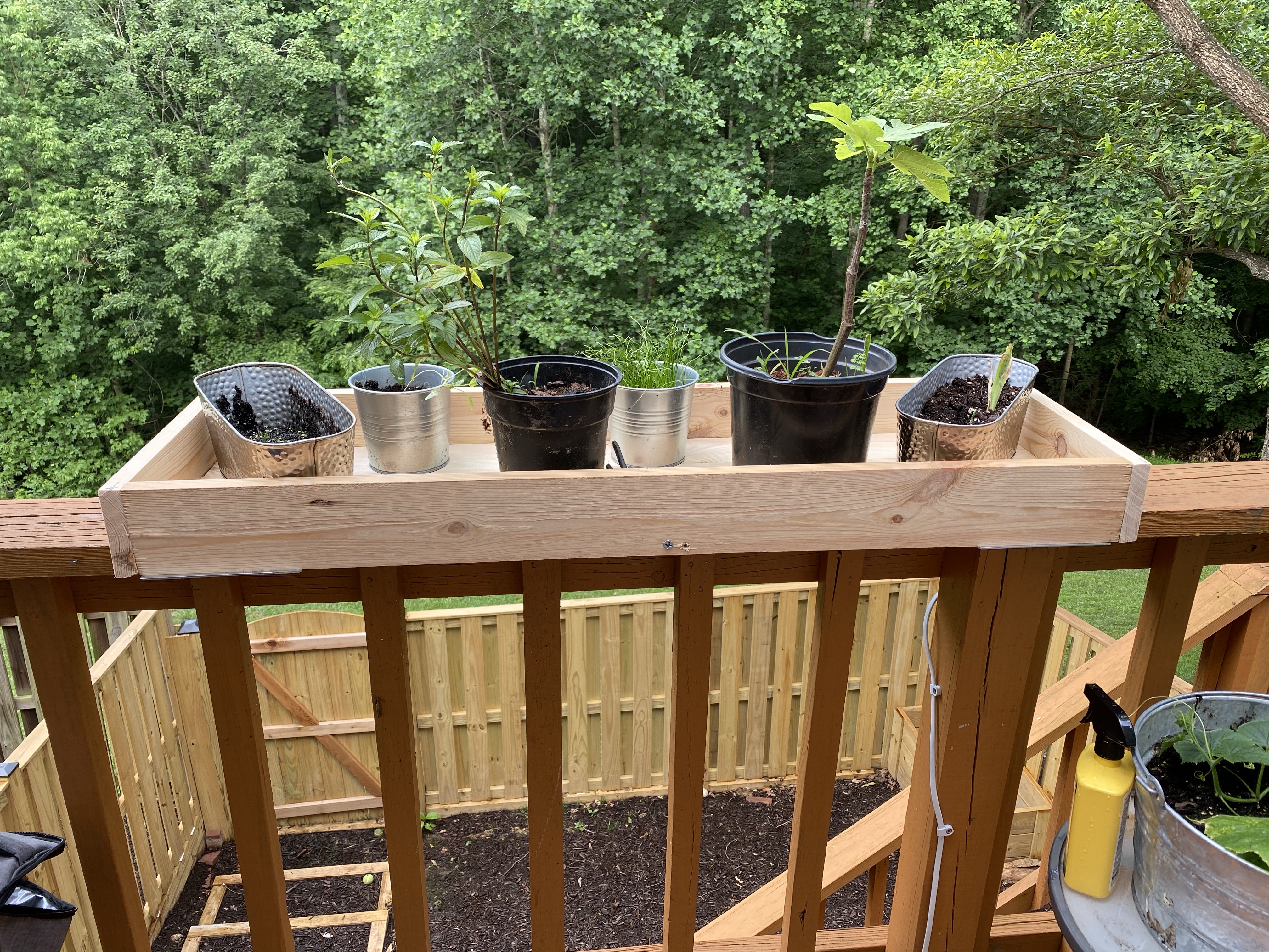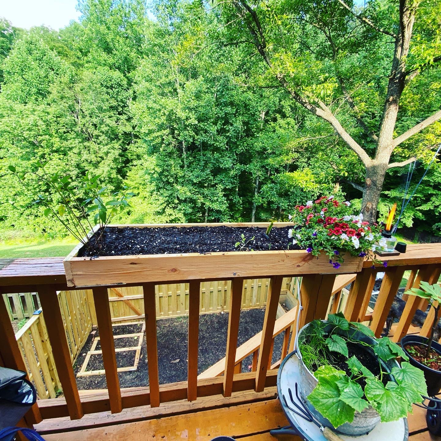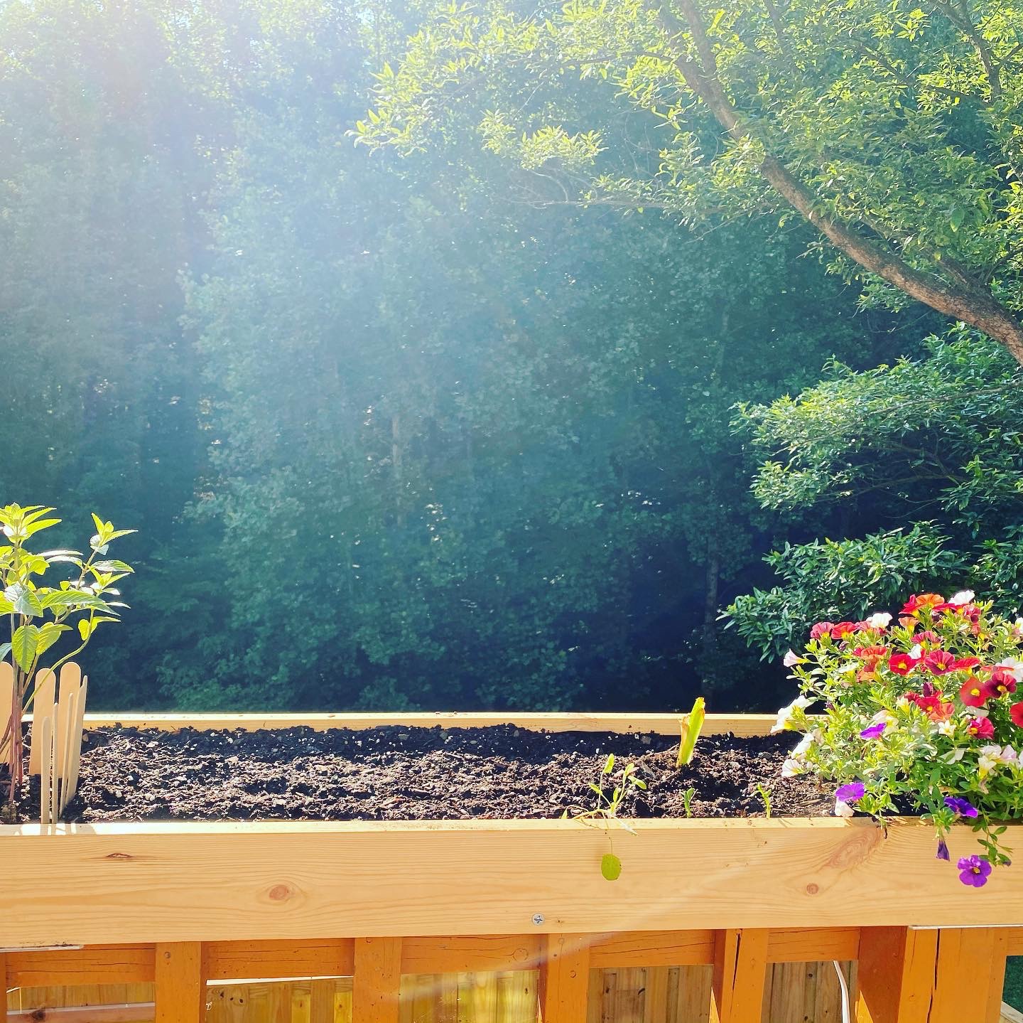 I would create my own planters box for the railing of my deck, the only place that gets fairly consistent sunlight. With the help of my father, I created this small box and re-homed all my baby plants. It’s not that you should build a planters box, but when I finished, I realized I had made an outdoor happy zone. The box was at eye level when I sat under our patio umbrella to write or work so I always had a view of the flowers or my growing cucumber plants.